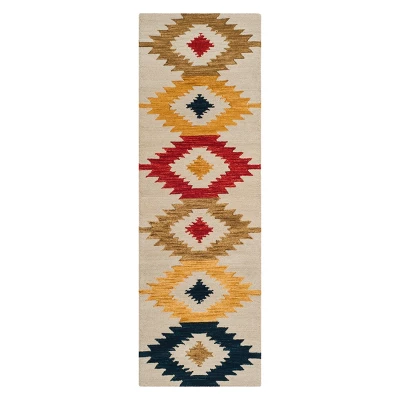 The trendy new look of rustic chic decor is marvelously captured in the native-art inspired designs and sublime color palette of the Holden Collection. Simple yet expressive, Holden revives geometric motifs with fashionable hues and a comfort-soft feel underfoot. The bright and eye catching of these rugs are cheerful and create a fun, airy atmosphere in the room. Made using pure wool in a low loop pile, this striking collection is perfectly styled for classy-casual home decor.