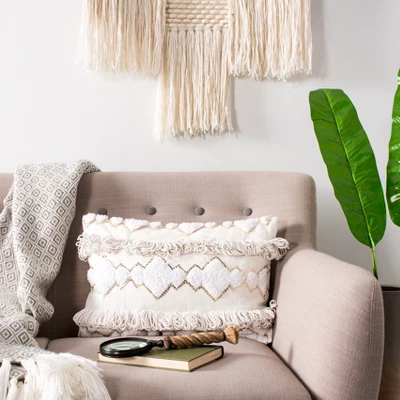 The soft cotton feel of the Marlin Pillow adds comforting textures to bohemian styled home furnishings. Diamond motifs are updated for contemporary décor preferences with gold sequins and ivory fringe accentuating the stylish pattern. A marvelous accent pillow for the living room, home office or den. Care Instructions: Pillows tend to flatten during transit, but these tips should help you get that pillow into its fluffiest shape quickly!Once unpacked, gently knead the pillow to help loosen the fibers. Throw the pillow in a dryer on a low tumble setting. The most important tip is to include a sock stuffed with a tennis ball to help “beat” the pillow into its fluffy form. Remove from the dryer, and proudly display your new piece of couch art!